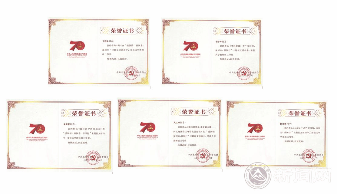 在喜迎新中国成立70周年的庆祝活动中,北方工大师生拿起手中的笔,通过撰写文章的形式,讲述身边的奋斗故事,礼赞新中国的伟大成就,并积极参与市委教育工委主办的“爱国情、强国志、报国行”主题征文活动,取得了良好的成绩。