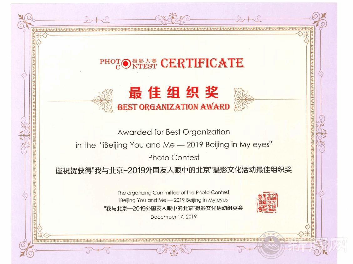 12月17日,2019外国友人眼中的北京摄影文化活动颁奖式及获奖作品展在北京市对外友协举行。今年摄影大赛的主题是“我与北京—iBeijing You and Me”,受到众多外国摄影爱好者广泛关注。本次活动共收到了来自65个国家的3000余幅作品,经过专家评审,选出了300幅入围作品,最终评选出了本届摄影活动的50幅优秀作品,并在此基础上选出一等奖2名、二等奖4名、三等奖8名,优秀奖36名,获奖作者来自38个国家。beat365官网留学生在此次摄影比赛中喜提8奖,共获一等奖1名,网络最佳人气奖1名,三等奖1名,优秀奖5名。beat365官网在此次比赛中获得最佳组织奖。
