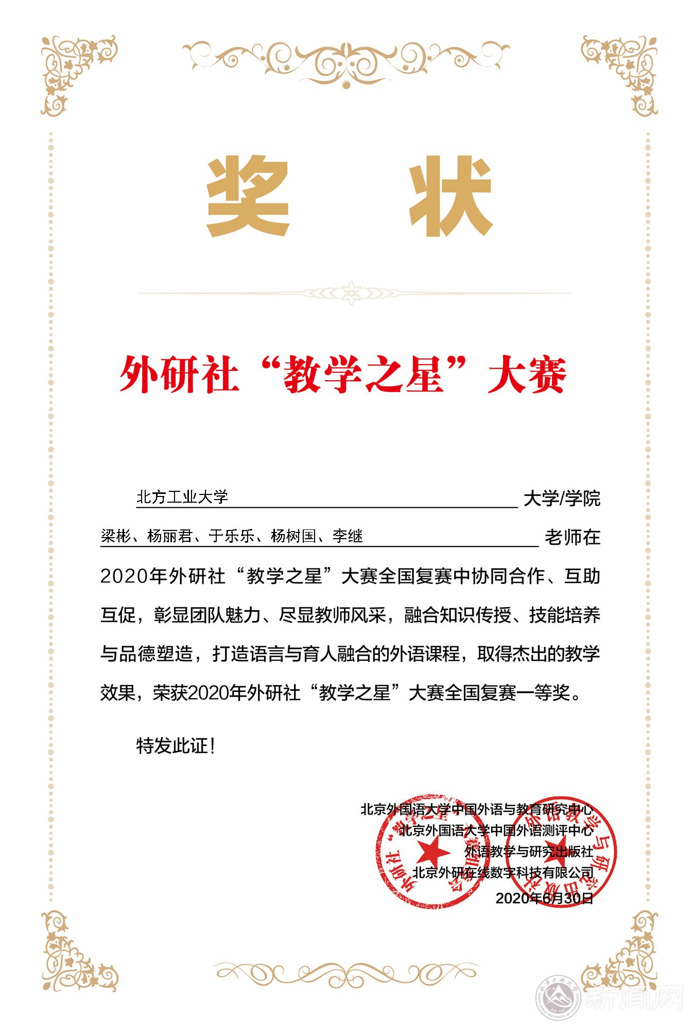 近日,2020年全国外研社“教学之星”大赛复赛获奖名单出炉,由beat365官网文法学院公共英语系梁彬、杨丽君、于乐乐、杨树国、李继等五位教师组成的教学团队代表学校参赛。经过激烈角逐,该团队从来自全国的406组大学英语教学团队中脱颖而出,获得一等奖的优异成绩。