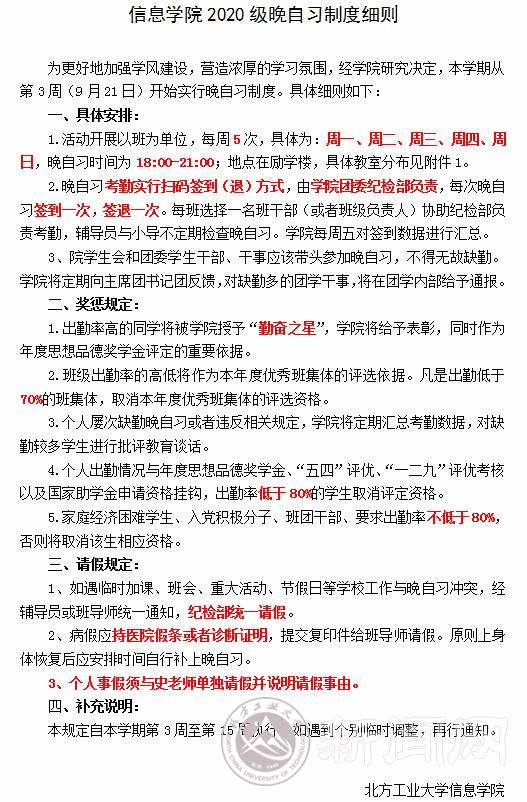 工欲善其事,必先利其器。信息学院在广泛征求师生意见,认真做好工作调研的基础上,从时间安排、请假流程、奖惩规定等方面修订完善晚自习制度,培养学生制度意识,促进朋辈帮扶,培育晚自习文化。