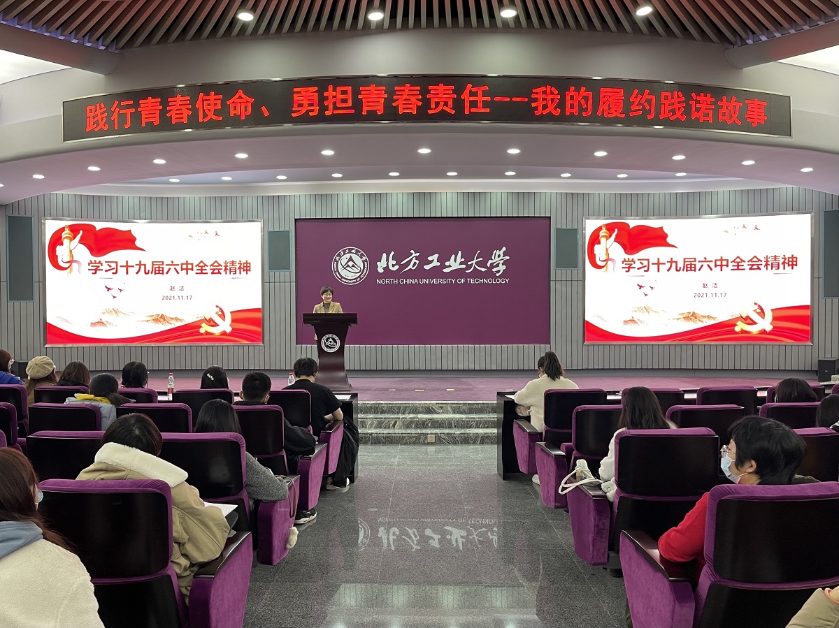 展示之后,学院党委副书记赵洁老师点评了同学们的展示情况和各支部同学们的履约践诺完成情况,带领大家集中学习了党的十九届六中全会精神。她指出,党的十九届六中全会的召开,是我党历史上又一次具有里程碑意义的重要会议,会议总结了党的百年奋斗重大成就和历史经验,明确了开启新征程的道路和方式。她强调,各党支部支委要根据学校和学院党委的要求,带领支部同学提高思想认识、认真领会精神,通过学习提升理论水平,通过学习坚定政治信仰。她希望同学们,从党的伟大历史经验中汲取力量,将所学用于日常工作中,发挥引领带动作用,带动身边同学、服务身边同学,让个人价值在奋斗中彰显。