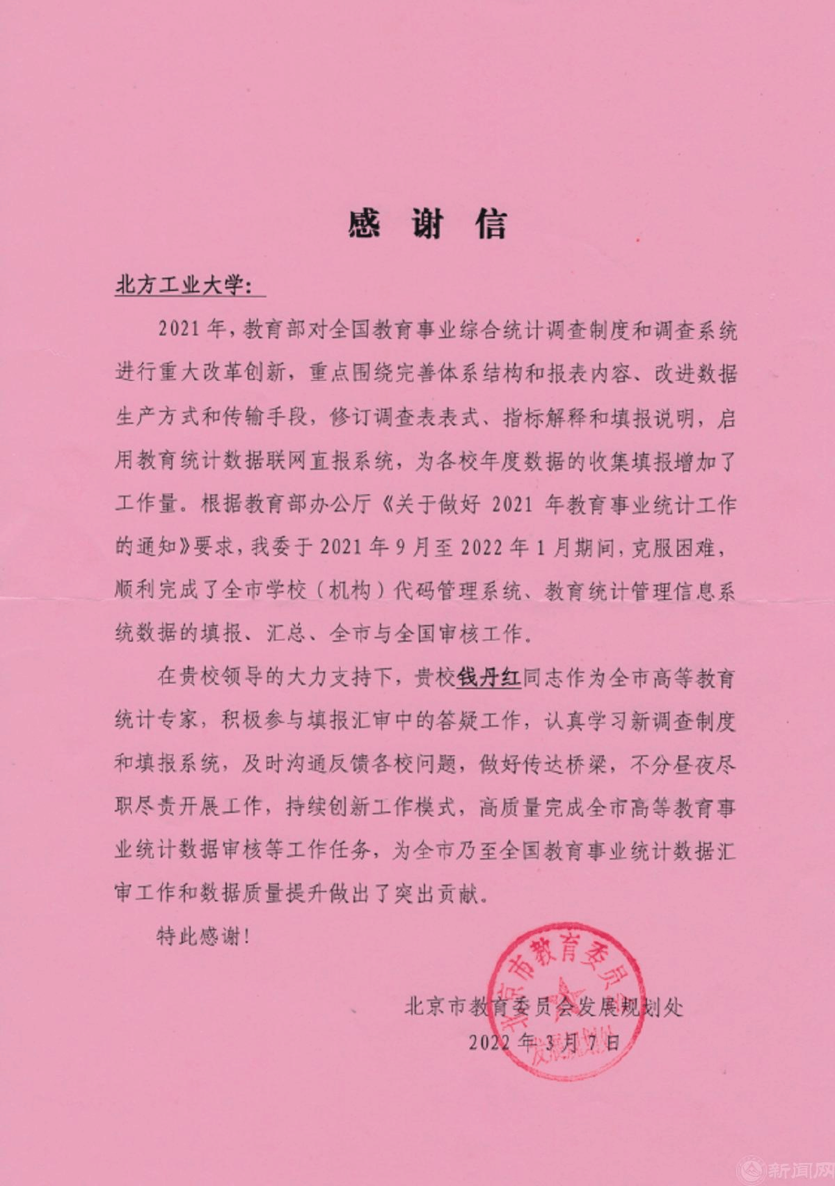 3月7日,学校办公室收到北京市教委发来的感谢信。信中指出,beat365官网钱丹红同志作为全市高等教育统计专家,在2021年9月至2022年1月期间,积极参与填报汇审中的答疑工作,认真学习新调查制度和填报系统,尽职尽责开展工作,持续创新工作模式,高质量完成全市高等教育事业统计数据审核等工作任务。