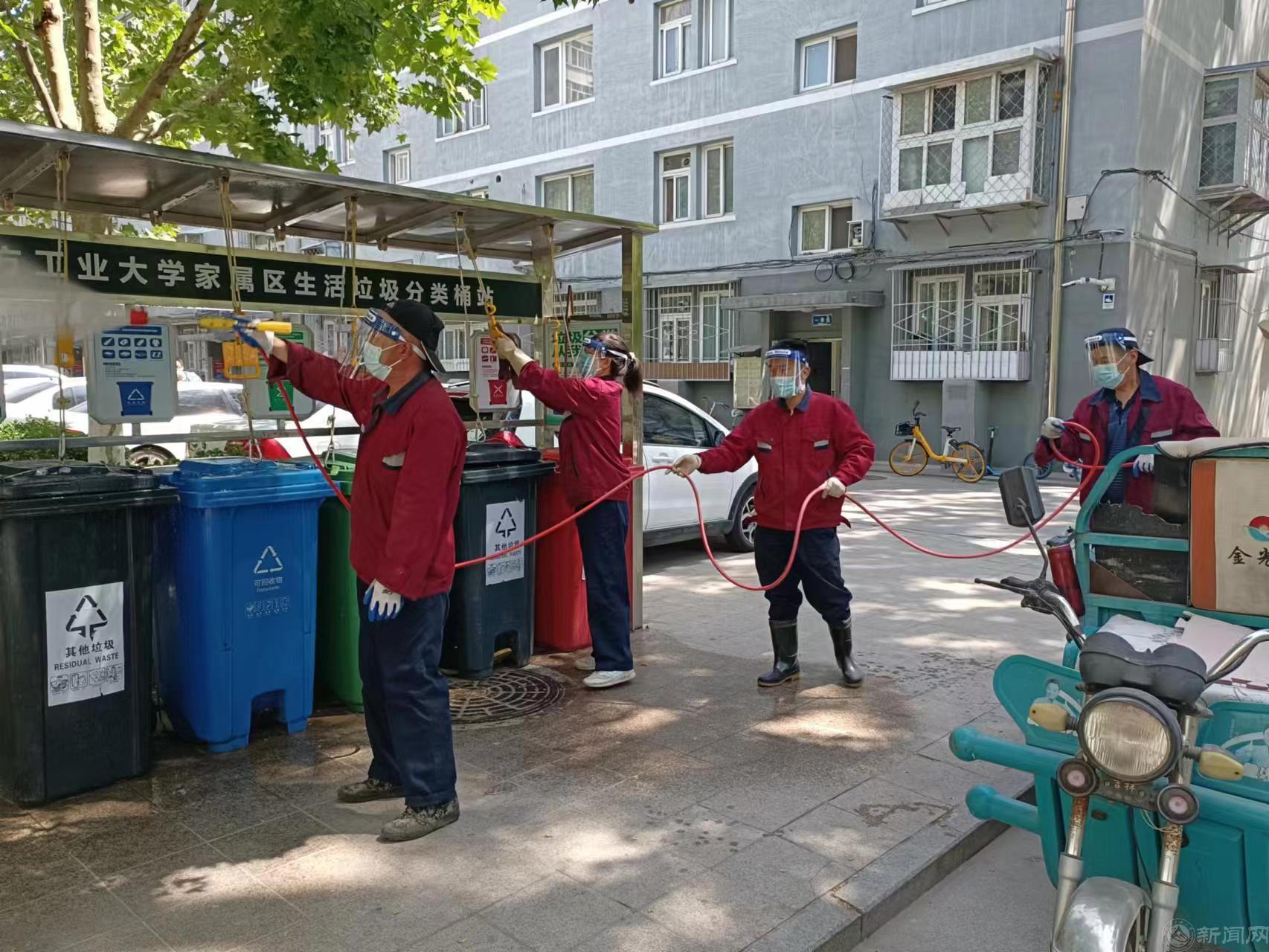校园公共区域消杀已经纳入常态化防控工作内内容,每日对校园内96个果皮箱、360个雨篦子以及临时宿舍、垃圾中转站等公共区进行喷洒消杀。