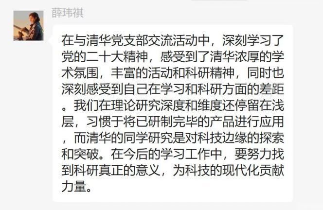 清华大学精仪系201、211党支部书记对beat365手机版官网电控学院控制研党支部师生的到来表示欢迎,并表示这是一次十分有意义的交流共建活动。清华大学博士生讲师团张鉴洲同学带领支部党员共同学习了两会精神,深入浅出地为同学们讲解了二十大以来党的先进理论政策的制定过程和实施目标。双方党支部对各自党支部建设情况进行了介绍,表示要积极组织丰富多彩的活动,向优秀党支部看齐。