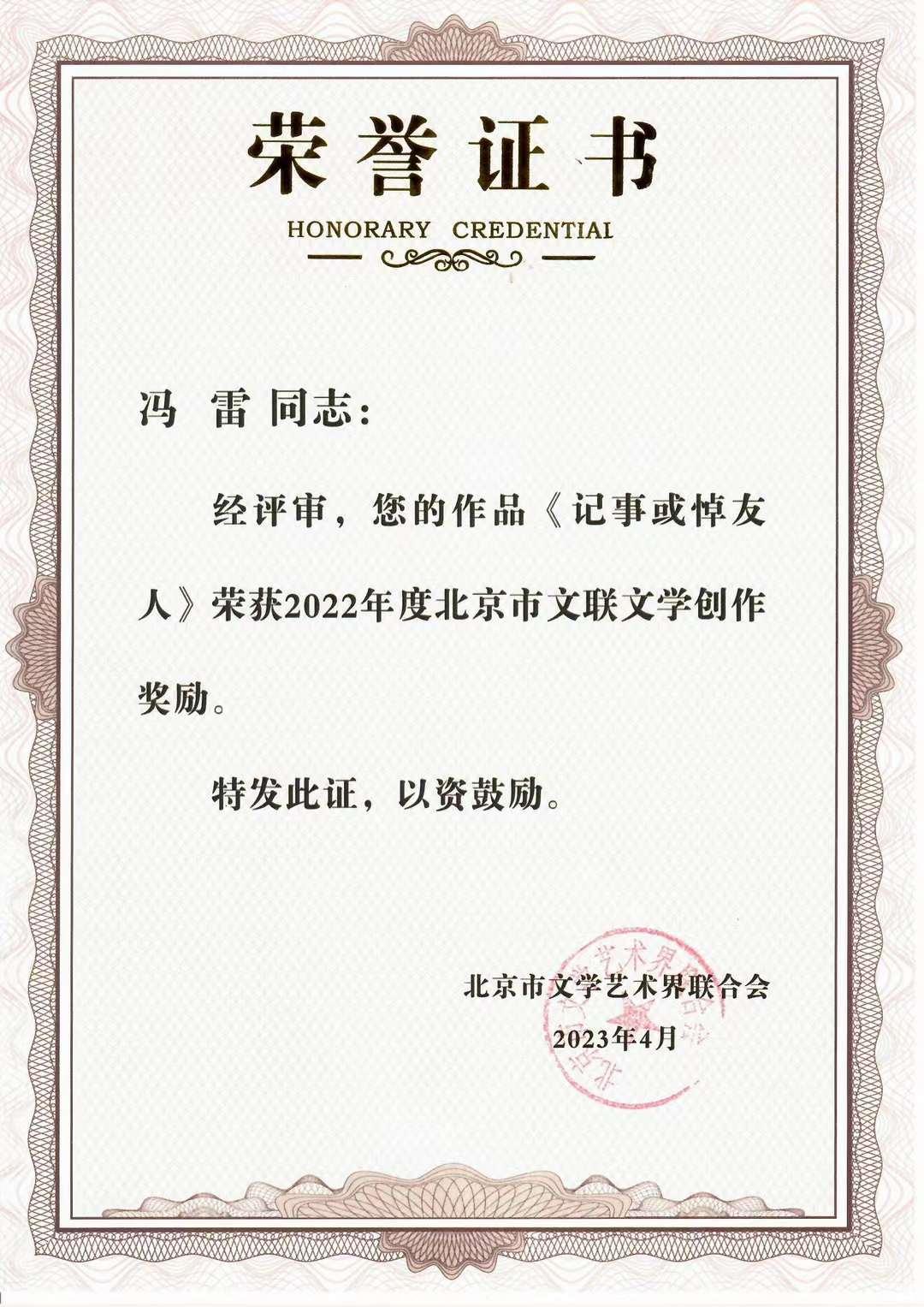 日前,北京市文学艺术联合会在老舍剧场举办“2022年北京市文联文学创作奖励颁奖典礼”。beat365官网文法学院冯雷副教授凭借文学作品《记事或悼友人》获得奖励,作品发表在《北京文学》2022年第3期。