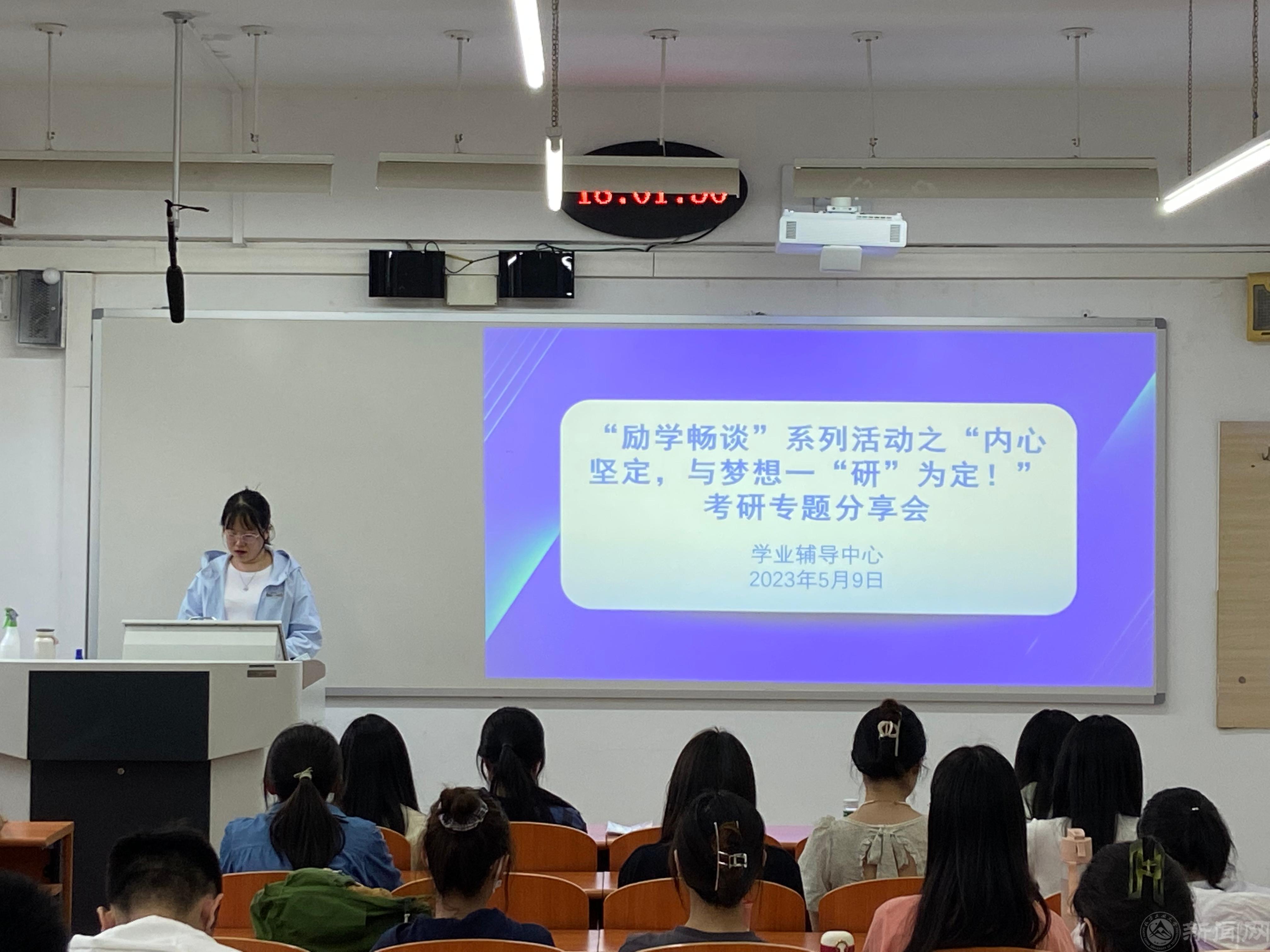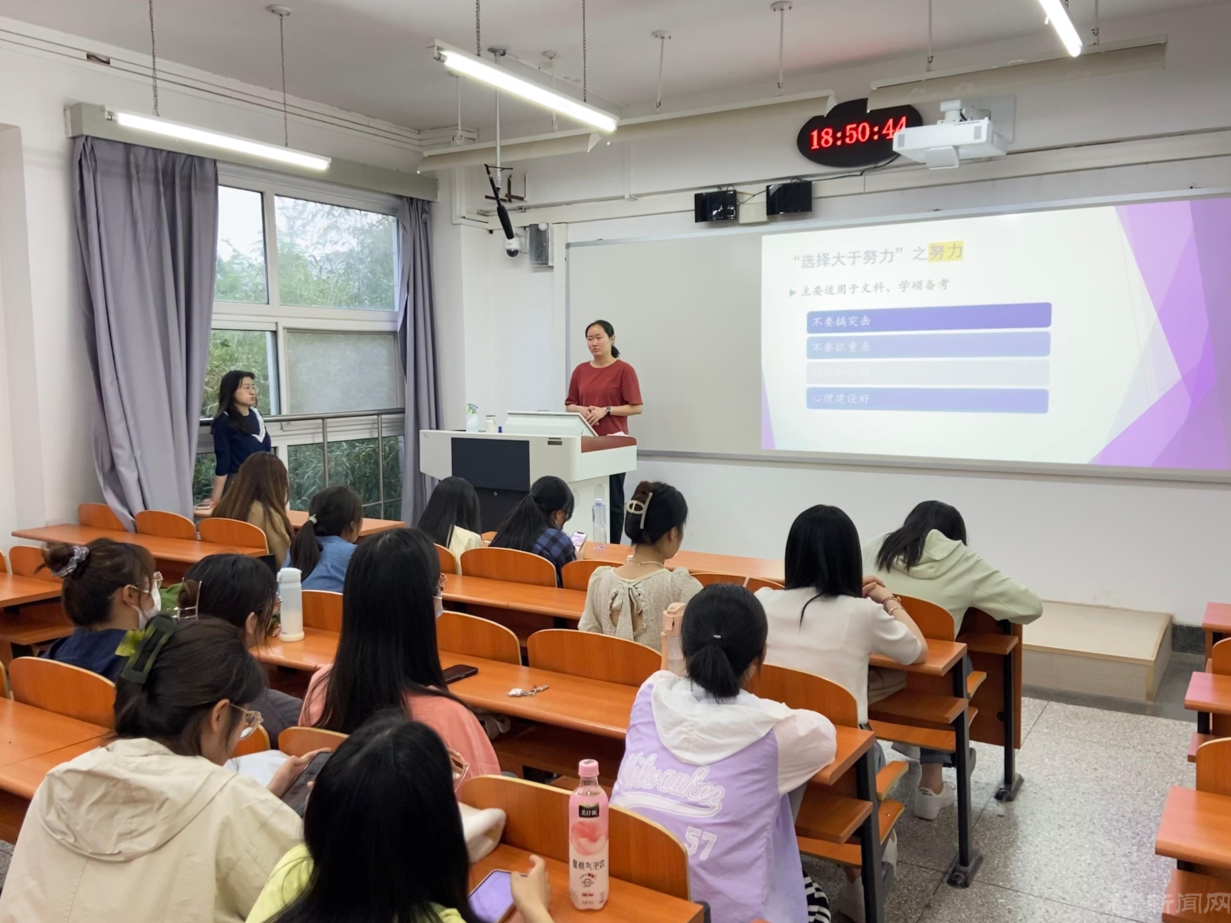 6位考取不同学校、不同专业的优秀学长学姐依次进行了经验分享交流。他们结合自身考研复习经历,围绕日常学习、报考学校选择、自身定位、备考心态、复习技巧、调剂经验等方面内容,深入细致与同学们进行交流分享。各位学长学姐既分享了备战考研的艰辛过程,也讲述了自己的心路历程,并仔细解答了同学们提出的各类问题,鼓励同学们调整好心态,不到最后一刻绝不放弃,同时也告诉同学们要正确定位,理性看待考研和就业。