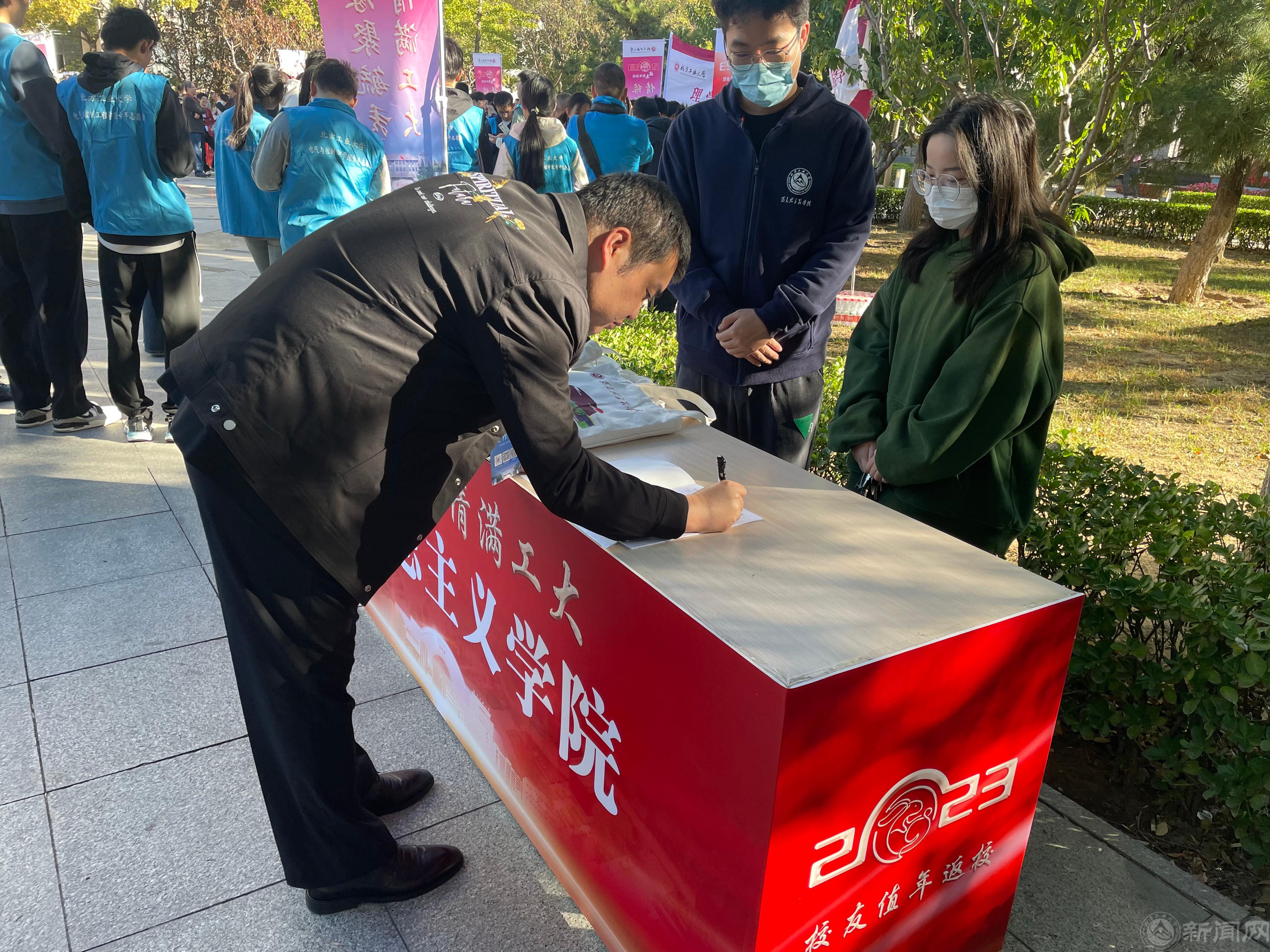 清晨的阳光刚刚升起,学院在图书信息楼北侧广场设置接待点,准备签名表、校友礼包、纪念品等。学院师生以饱满的热情,准备迎接每一位到来的校友。