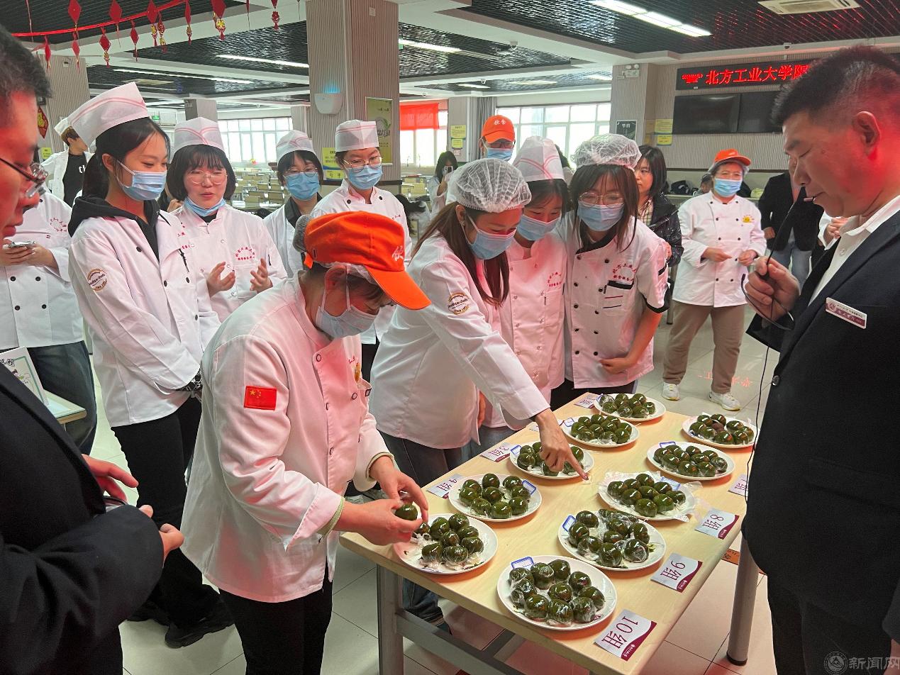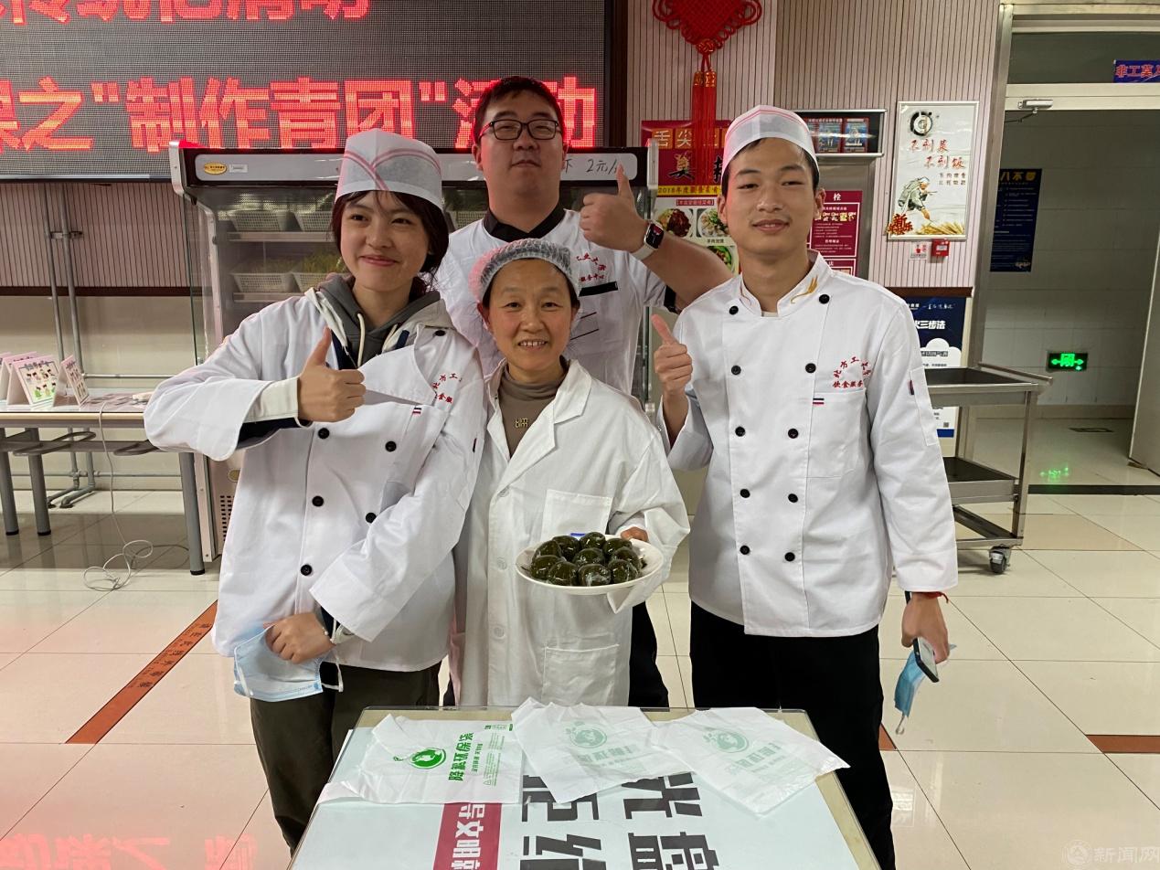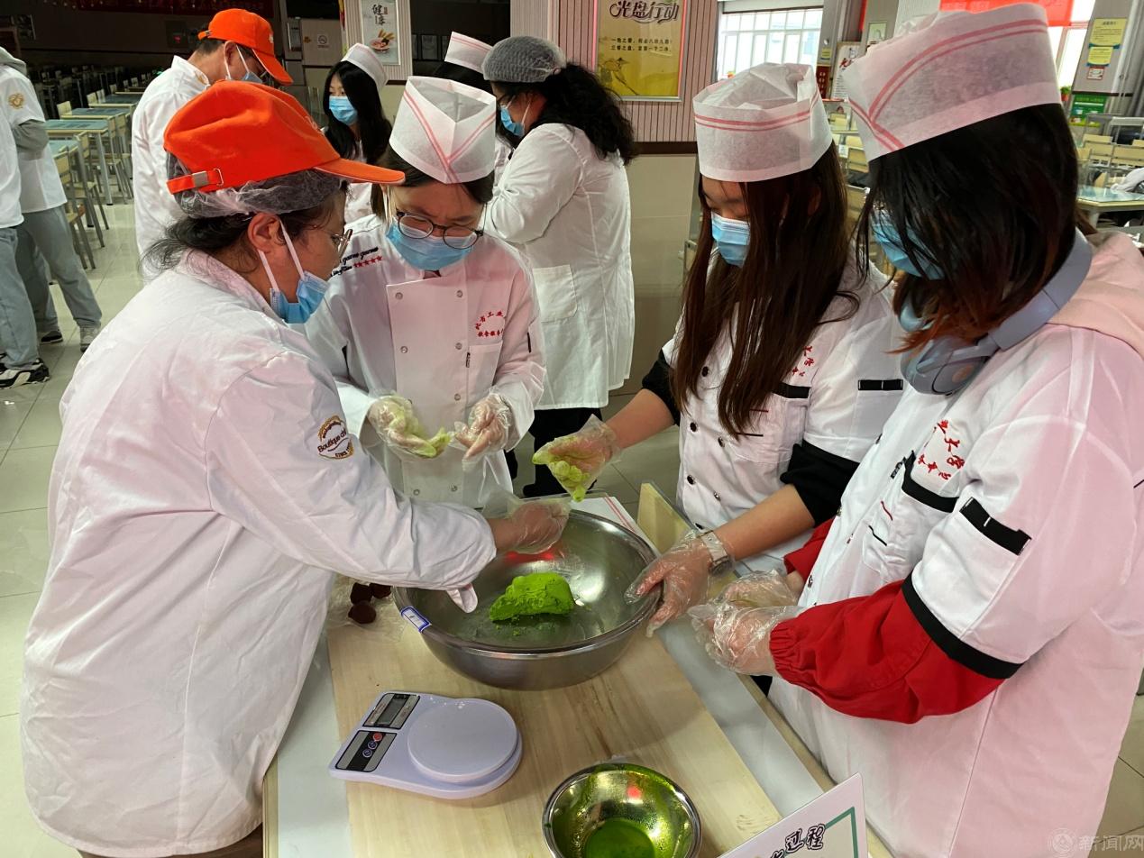 同学们穿上食堂准备的一整套厨师服,分成10组进行现场制作,每组都配备了一名厨师同步指导。在师傅们的悉心指导下,同学们不仅学会了和面、揉皮、包馅、成型,还发挥创意,尝试制作出不同口味和形状的青团。