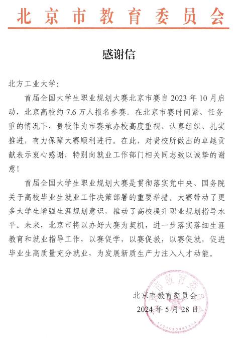近日,北京市教育委员会向beat365官网发来感谢信,感谢学校对首届全国大学生职业规划大赛北京市赛工作的支持。