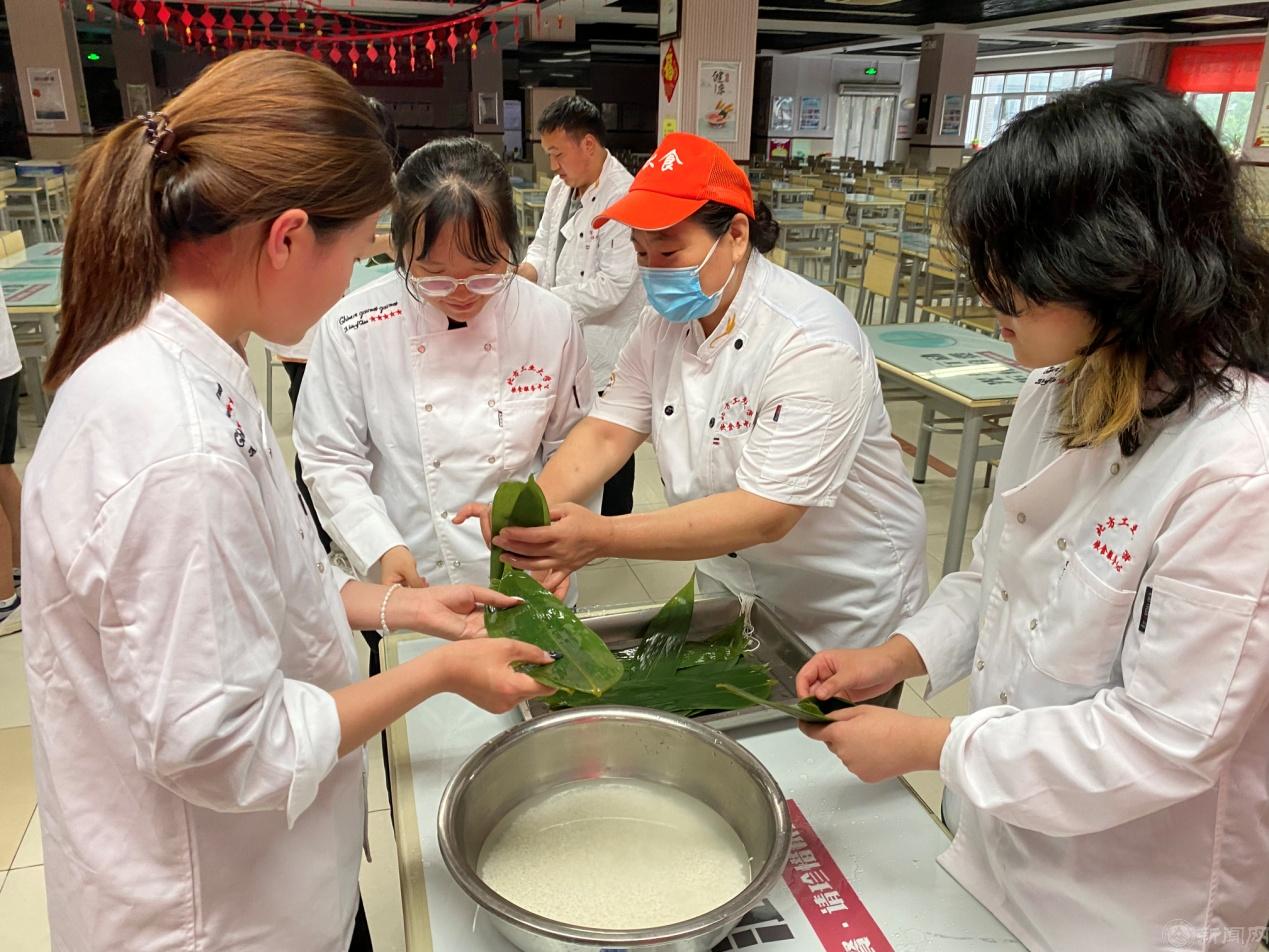 教工餐厅经理胡明学从端午节的起源、习俗开始讲解,对饮食服务中心特色保障、服务育人以及取得的荣誉等方面工作进行简要介绍。胡京雷师傅则从粽叶的挑选、糯米的浸泡技巧,到馅料的巧妙搭配和粽子的包扎方法,为同学们演示和讲解包粽子的每一个步骤。