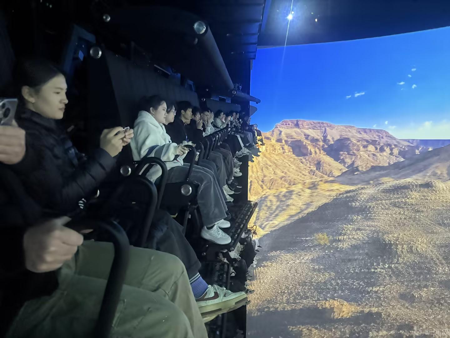 飞览天下主题馆作为石景山游乐园爱国主义教育基地示范店,通过数字光影技术和飞行体感设备结合,使人沉浸入梦幻般的飞翔世界。体验者在拥有国际专利技术的飞行座椅平台上,裸眼体验急速拉升、失 重、俯冲、滑翔等真实的飞行感受。水雾、吹风、香氛等技术的叠加,可云中漫步九天揽月,可展翅翱翔一览山河,可潜入江海波澜壮阔。让体验者饱览祖国大好河山,领略人文历史,实现寓教于乐,热爱祖国的教育目的。信息学院师生一行在八角游乐园飞行体验官的指引下,走进充满了科技感和未来感的飞越馆。太空舱般的预演厅播放着飞越国家的地理人文知识,和飞行安全须知,全新的创意让人耳目一新。体验《飞越中国》,通过i-Ride设备的拟真体验,搭乘飞行座椅在14米高空,直径20米球幕中,俯览大美中国。其以引人入胜的展示效果,强烈的感官冲击,生动且真实地呈现了我国大好河山,带观影者穿越时空,一跃万里,身临其境地领略祖国的幅员辽阔、地大物博。飞越故宫初雪,跨越600年的历史沉淀,多少炎黄子孙,一片碧血丹心,为实现“中国梦”而奋斗。体验《飞越世界》,从新西兰的皇后镇到迪拜的摩天大楼,从埃及的金字塔到俄罗斯的广袤土地,从法国的浪漫风情到英国的历史遗迹,最后回到中国的宏伟壮观,领略世界的多样性,是一场场跨越国界的奇妙之旅一起见证世界的辉煌与美丽。