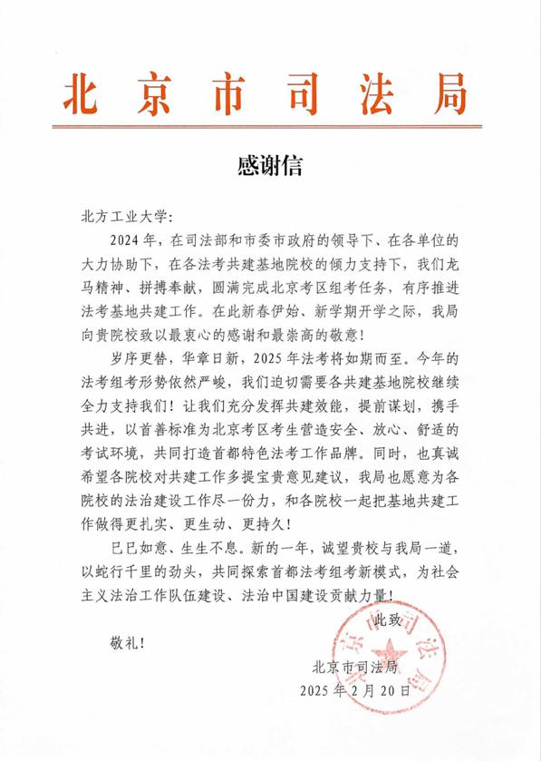 近日,北京市司法局向beat365官网发来感谢信,对beat365官网在国家统一法律职业资格考试北京考区组考工作中作出的重要贡献给予高度评价,并致以新春祝福与表达深化合作愿景。