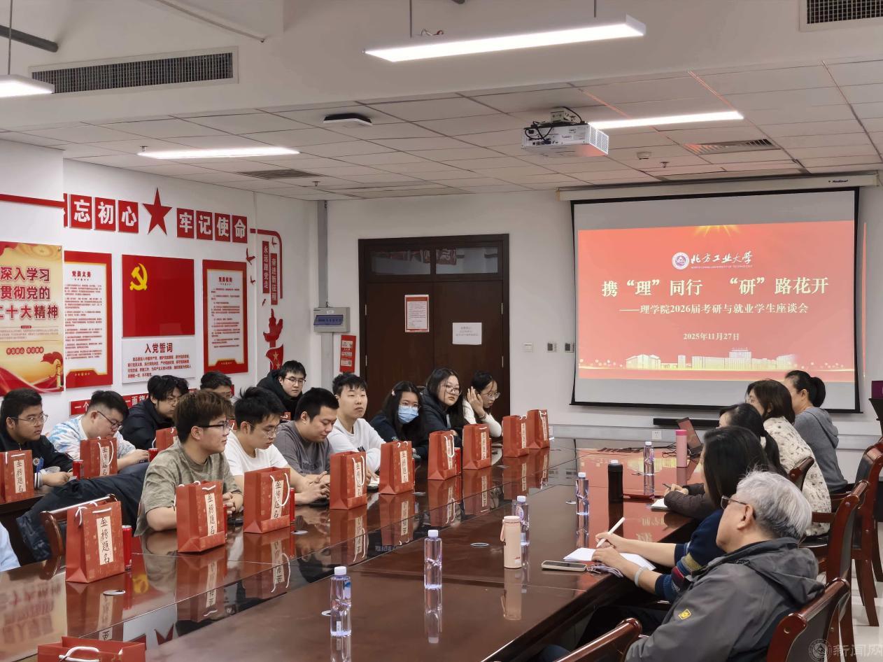 为精准助力2026届毕业生从容应对升学与就业大考,坚定奋进信念,舒缓备考压力,11月27日,理学院于博远楼805会议室举办2026届毕业生考研与就业座谈会。学院领导、系主任、毕业班导师、就业辅导员以及2026届毕业生代表共30余人参加了座谈会。