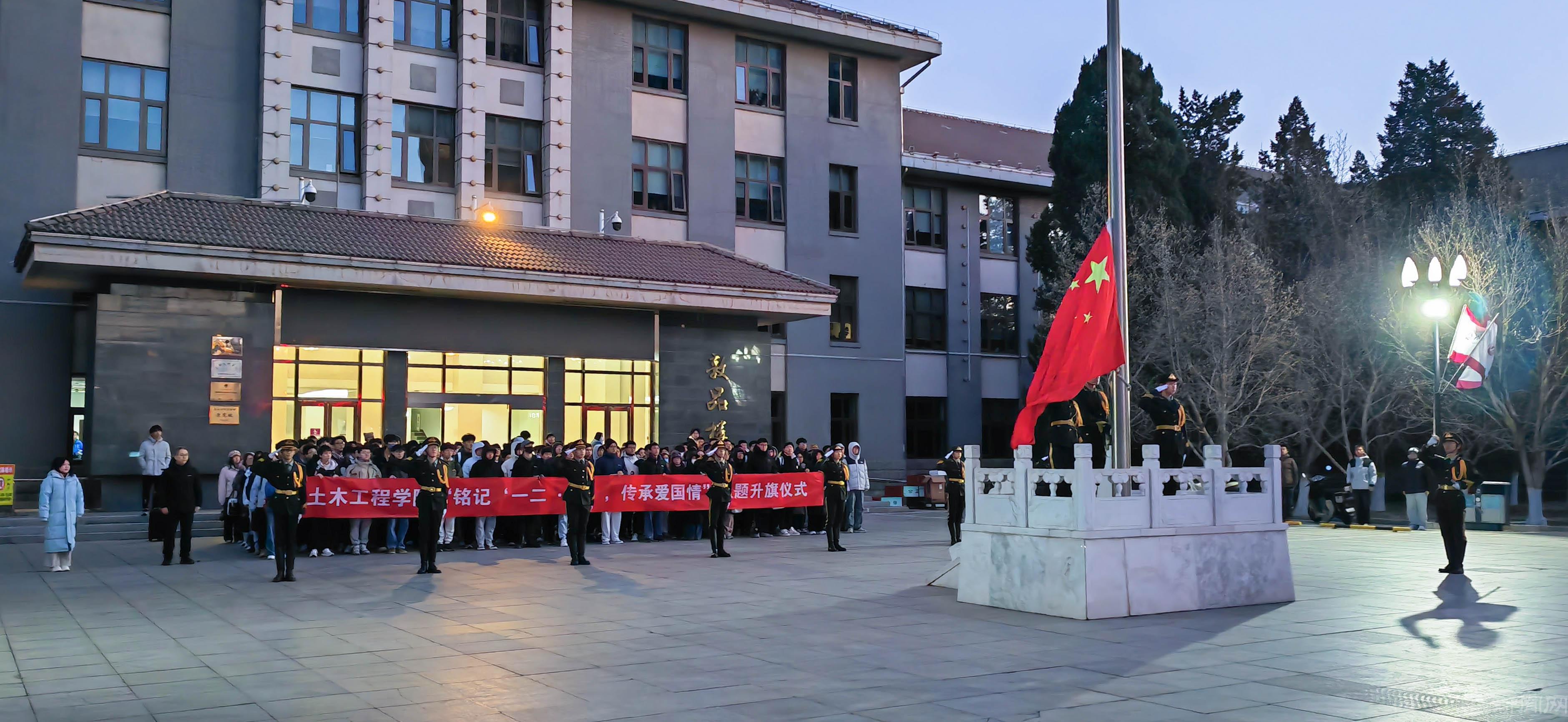 为纪念“一二 • 九”运动90周年,深化爱国主义教育,扎实推进2025级新生引航工程和学风建设,12月8日清晨,土木工程学院在敦品楼前举行“铭记‘一二 • 九’,传承爱国情”主题升旗仪式,学院党委副书记冯少杰、团委书记金磊、辅导员孙永君及2025级学生参加。