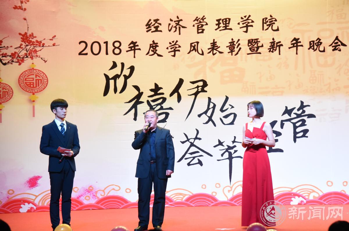 晚会现场,院长赵继新老师向学院全体师生送出了新年寄语,他对大家一年来的表现给予了肯定,表示大家在学校党委的正确领导下,经历了忙碌,也收获了成绩。成绩的取得离不开个人的坚持、更离不开团队的协作。赵老师指出,2018年正值国家改革开放40周年,祖国的快速发展,给我们提供了机遇,更带给我们挑战,他希望同学们都能将个人利益同国家发展相结合,努力成长为栋梁之才,永葆青春活力和热情,发挥“经管人”优良传统,持之不懈、努力拼搏,为国家建设贡献青春力量。