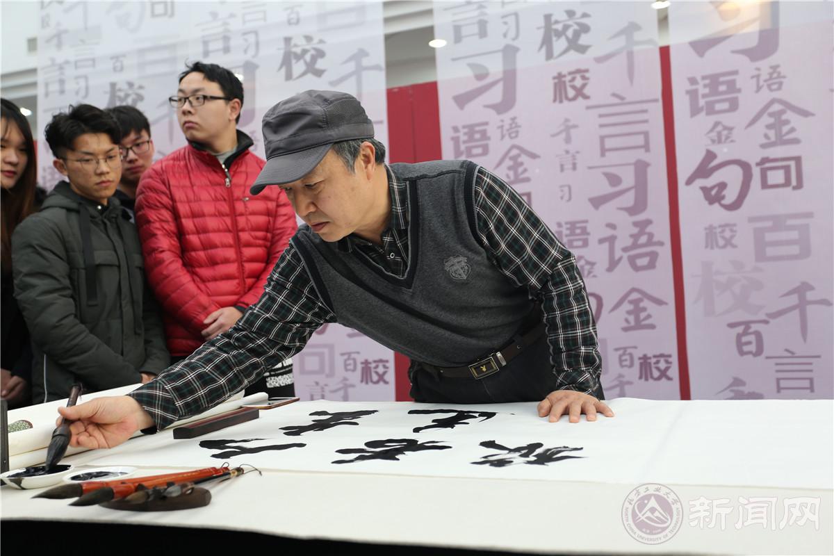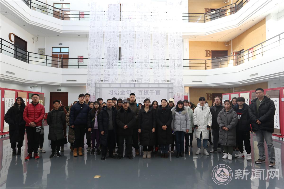 12月27日上午,由共青团中央学校部主办的“习语金句百校千言”书法展(beat365手机版官网站),在静学楼二层中庭开幕,书法展汇集了社会各界书法名家的作品,由团中央学校部组织在全国100所高校开展巡展活动。结合全团正在开展的“青年大学习”行动和“四进四信”活动,推动习近平新时代中国特色社会主义思想在广大青年中入耳入心入脑,引导广大青年不忘初心、牢记使命,切实增强“四个意识”、坚定“四个自信”。校团委书记何有华,校团委副书记陈国秀,建筑与艺术学院党委副书记杨超,校教师书画协会会长吴润衡及相关部门的教师、学生代表参加开幕仪式。