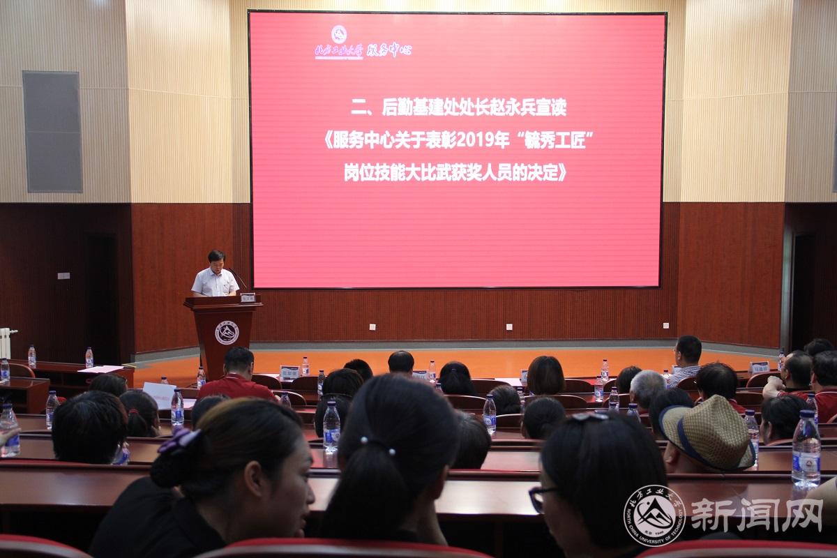后勤基建处处长赵永兵宣读《服务中心关于表彰2019年“毓秀工匠”岗位技能大比武获奖人员的决定》,对取得优异成绩的职工进行表彰。后勤基建处处长赵永兵、服务中心总经理胡春江、后勤基建处副处长杨培鑑、刘通祥对在此次活动中获奖职工代表颁发了获奖证书。