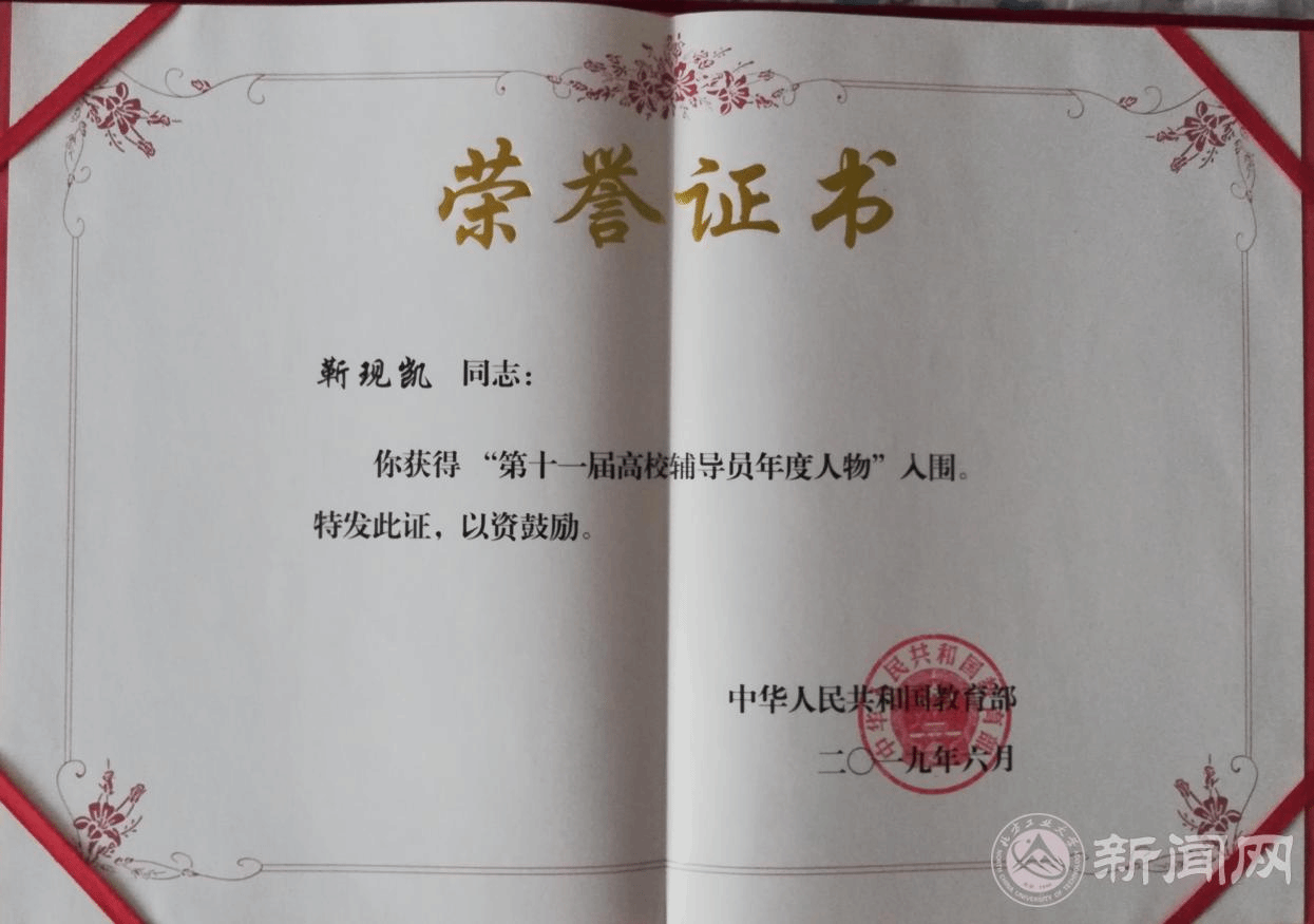 近日,全国“第十一届高校辅导员年度人物”评选结果揭晓,beat365官网信息学院辅导员靳现凯被授予“第十一届高校辅导员年度人物入围”荣誉称号。
