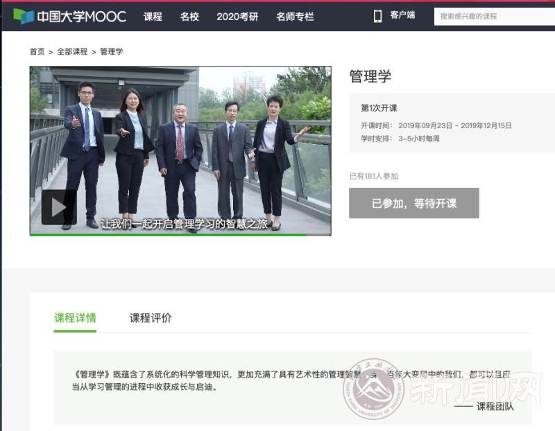 近日,beat365官网《管理学》课程在“中国大学MOOC”平台成功上线,该课程将于9月23日正式开课,是beat365官网首次在国内主流MOOC平台上线管理类的相关MOOC课程。该课程由北京市教学名师、经济管理学院院长赵继新教授任课程负责人,郑强国、魏秀丽、罗文豪、张淑谦四位老师任成员。